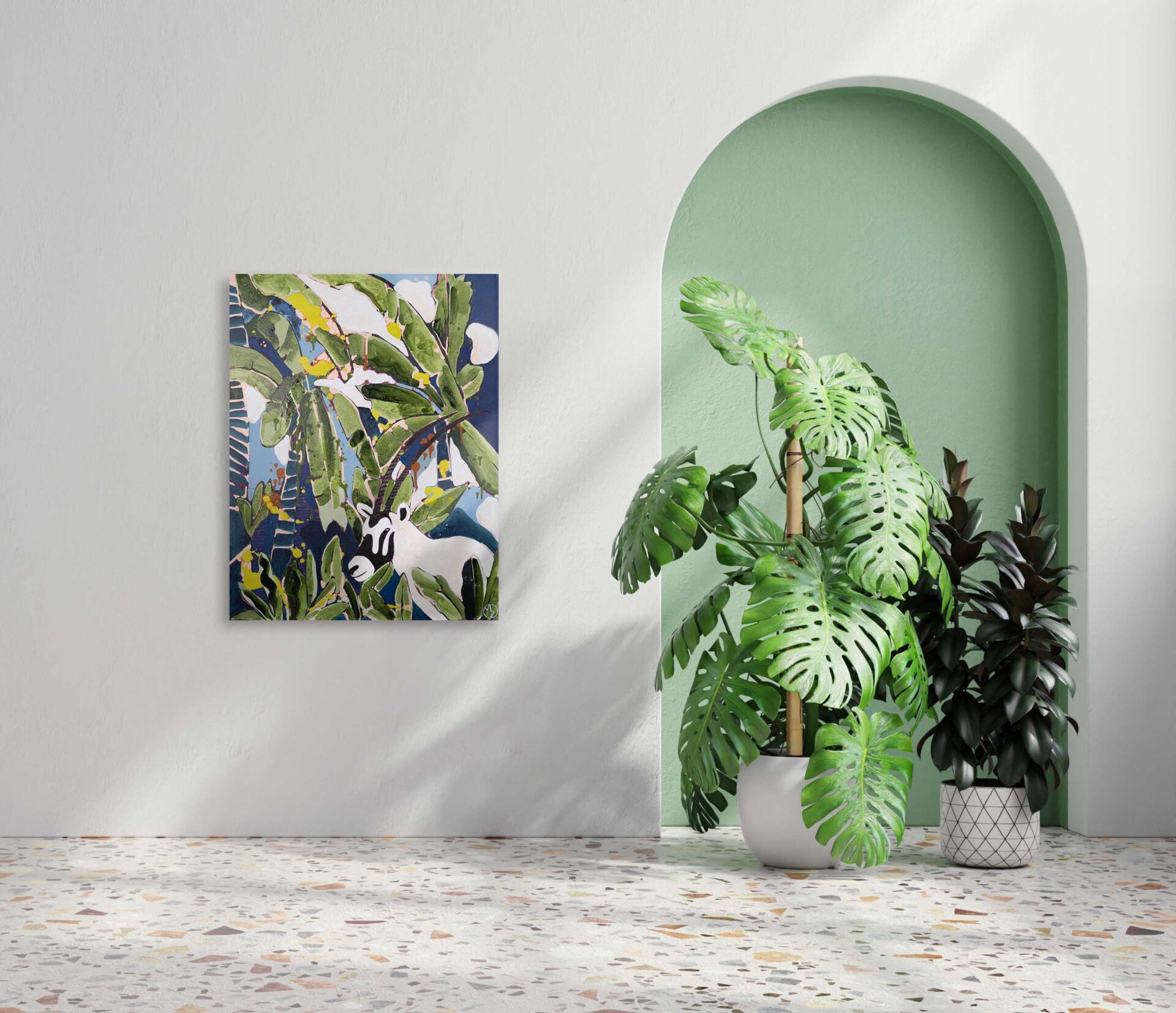 Arabian Oryx showcases the beauty and resilience of the Arabian Oryx, set against a lush backdrop of palm trees and vibrant greenery. The choice of this majestic animal ties the piece to the region, where the oryx is a symbol of strength and the spirit of the desert. Rich greens and blues bring the scene to life, capturing the essence of an oasis. The artwork celebrates the natural beauty and cultural significance of the region, offering a serene yet powerful representation of the Arabian wilderness.