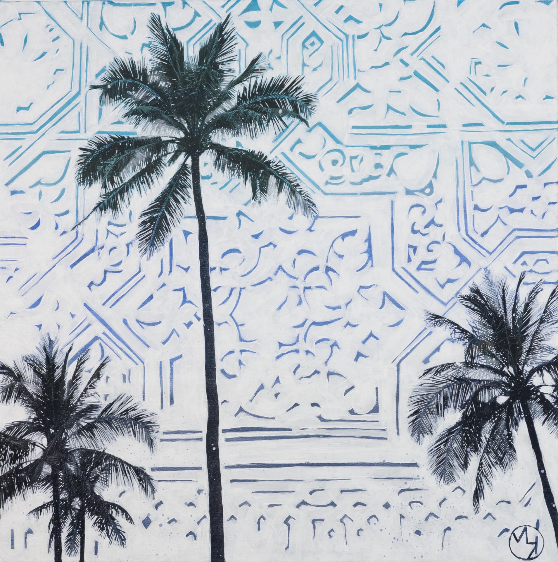 Veil of Palms is part of the Fusion Realms collection, where nature and heritage intertwine, creating surreal landscapes that bridge the organic and the geometric. By merging botanical elements like cacti and palms with intricate Middle Eastern patterns, these artworks explore the harmony between two seemingly contrasting worlds. Digital collage and painterly techniques come together to form vibrant, dreamlike compositions—blurring the lines between reality and imagination. Fusion Realms is a reflection on identity, place, and the beauty found in the unexpected connections between tradition and the natural world.